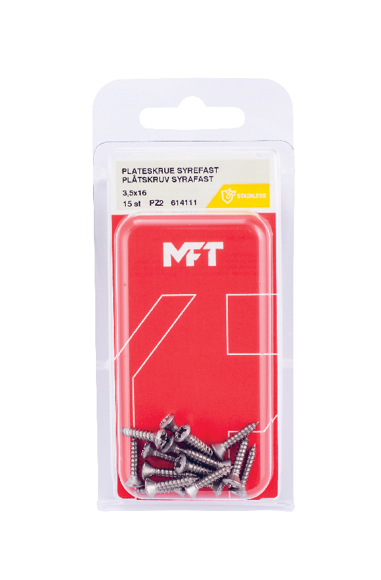 MFT Plateskrue med linsehode KFXS er beregnet for montasje mot underlag av tre eller mot tynnplater. Ved montasje i tynnplate kreves forborring. For innendørs og utendørs bruk.