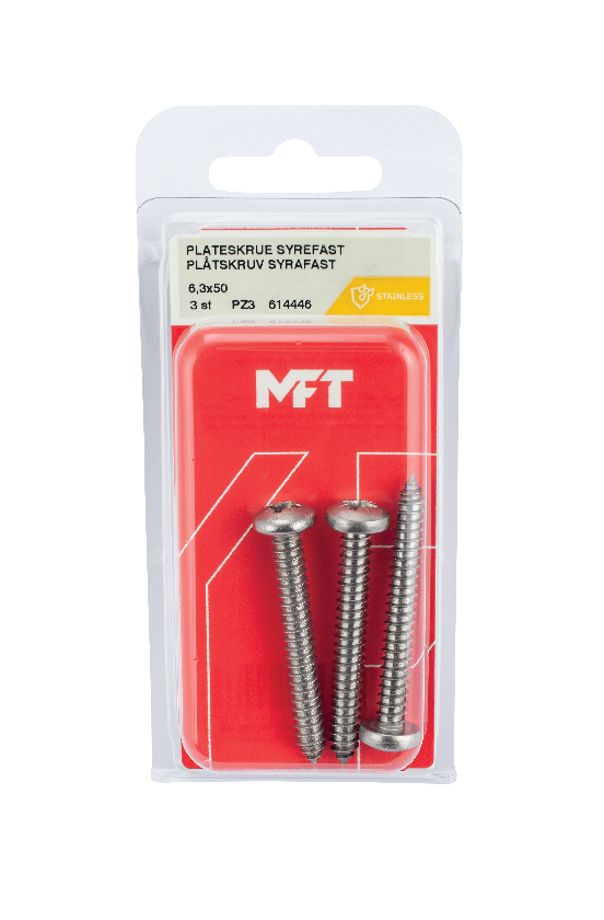 MFT Plateskrue med Panhode RXS er produsert i henhold til DIN7981/ISO7049 standard for syrefast A4 stål AISI 316. Korrosjonsklasse C5. Helgjenget og gjengepressende. PZ bitsfeste.
