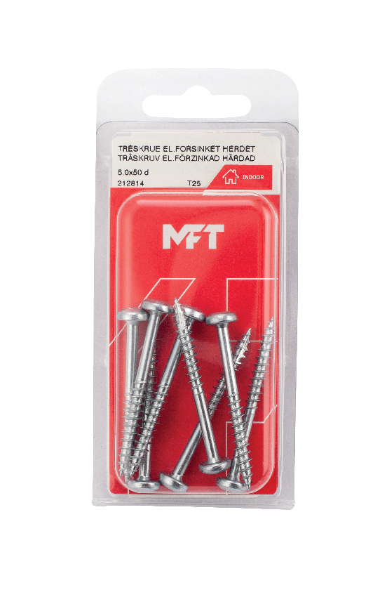 MFT Treskrue med panhode har en elektrolytisk overflatebehandling og er produsert av herdet karbonstål, AISI-1022. Korrosjonsklasse C1. Skruen er vokset for lavere innskruingsmoment. Skruspissen har et fiberskjær som reduserer faren av sprekkdannelse ved montering. TX bitsfeste for optimalt grep mellom bits og skrue.