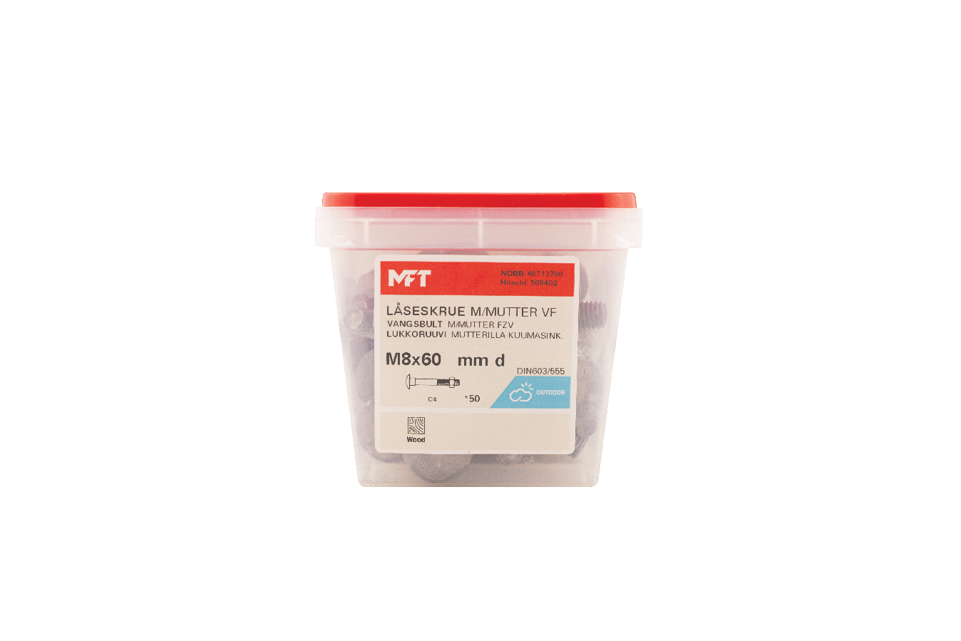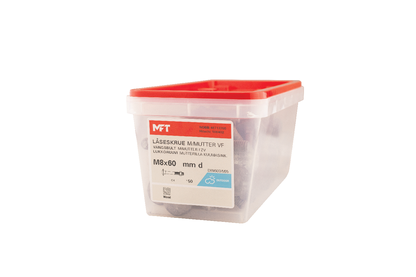 MFT Låseskrue med mutter brukes for sammenskruing av trestendere, platematerialer mot underlag av tre eller stål. Under det kuppelformede hodet er det en firkant som fungerer som en låsing i det mykere materialet da sammenskruing skjer. For innendørs og utendørs bruk.