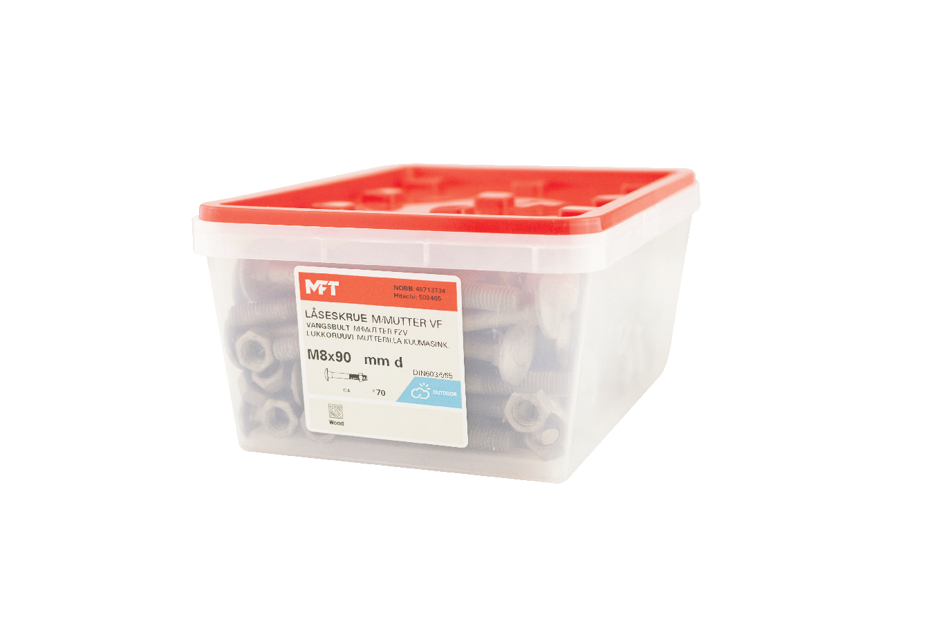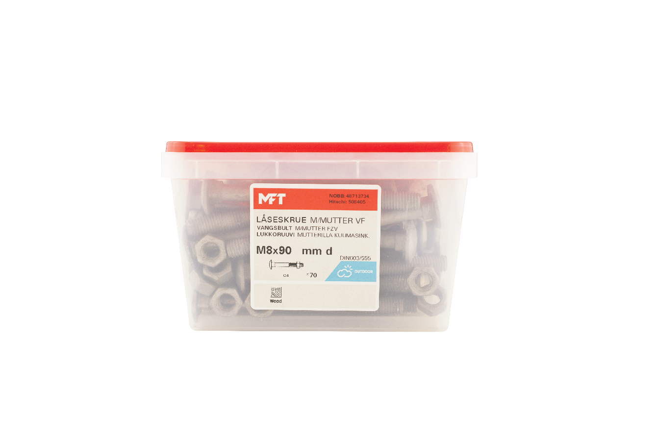 MFT Låseskrue med mutter, låseskruen er produsert i henhold til DIN603 og mutter i henhold til DIN934 standard i herdet karbonstål, kvalitet 4.8. Låseskrue og mutter har en varmforsinket overflatebehandling. Korrosjonsklasse C3. Delgjenget.