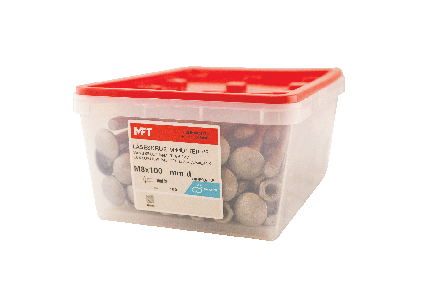 MFT Låseskrue med mutter, låseskruen er produsert i henhold til DIN603 og mutter i henhold til DIN934 standard i herdet karbonstål, kvalitet 4.8. Låseskrue og mutter har en varmforsinket overflatebehandling. Korrosjonsklasse C3. Delgjenget.