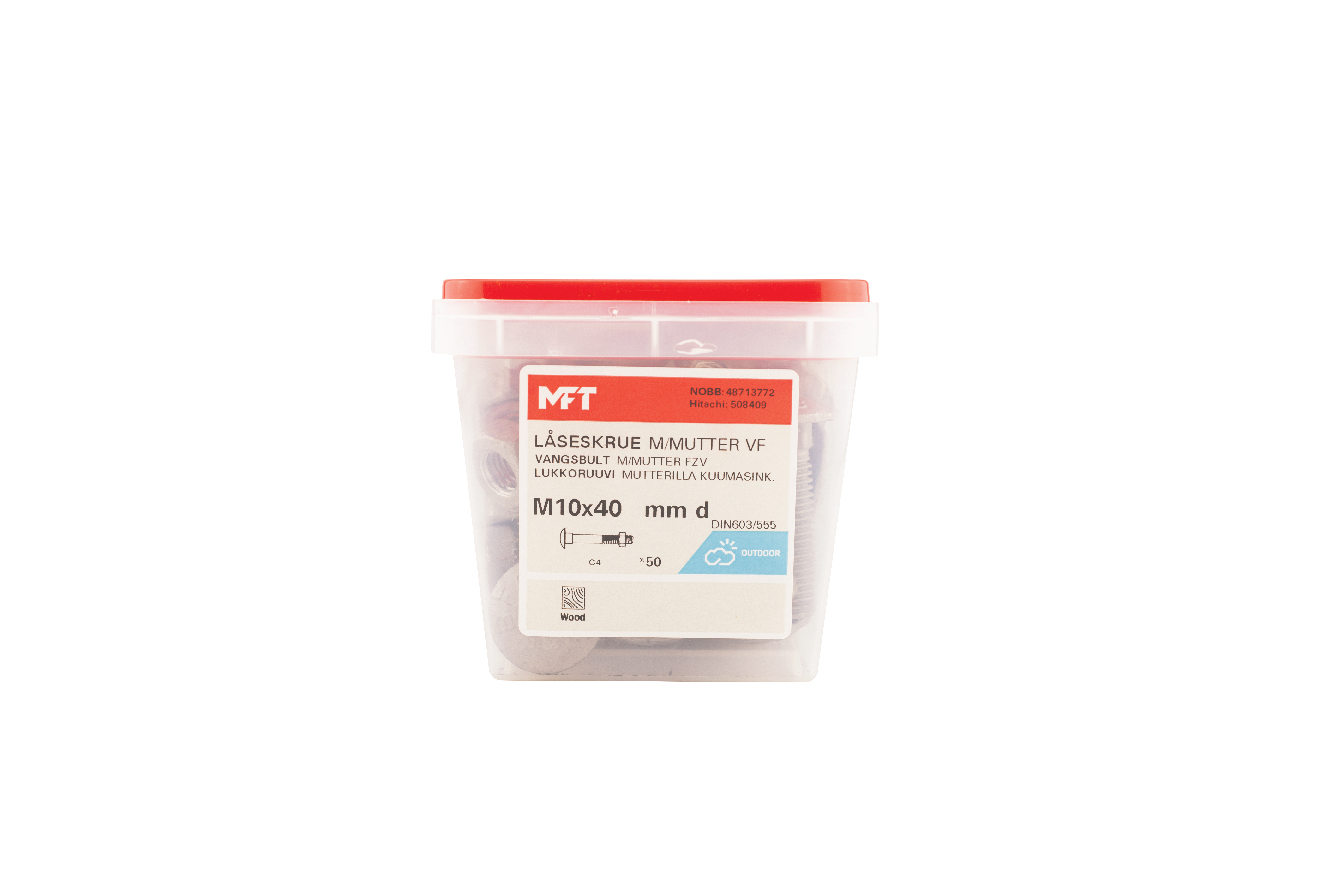 MFT Låseskrue med mutter brukes for sammenskruing av trestendere, platematerialer mot underlag av tre eller stål. Under det kuppelformede hodet er det en firkant som fungerer som en låsing i det mykere materialet da sammenskruing skjer. For innendørs og utendørs bruk.
