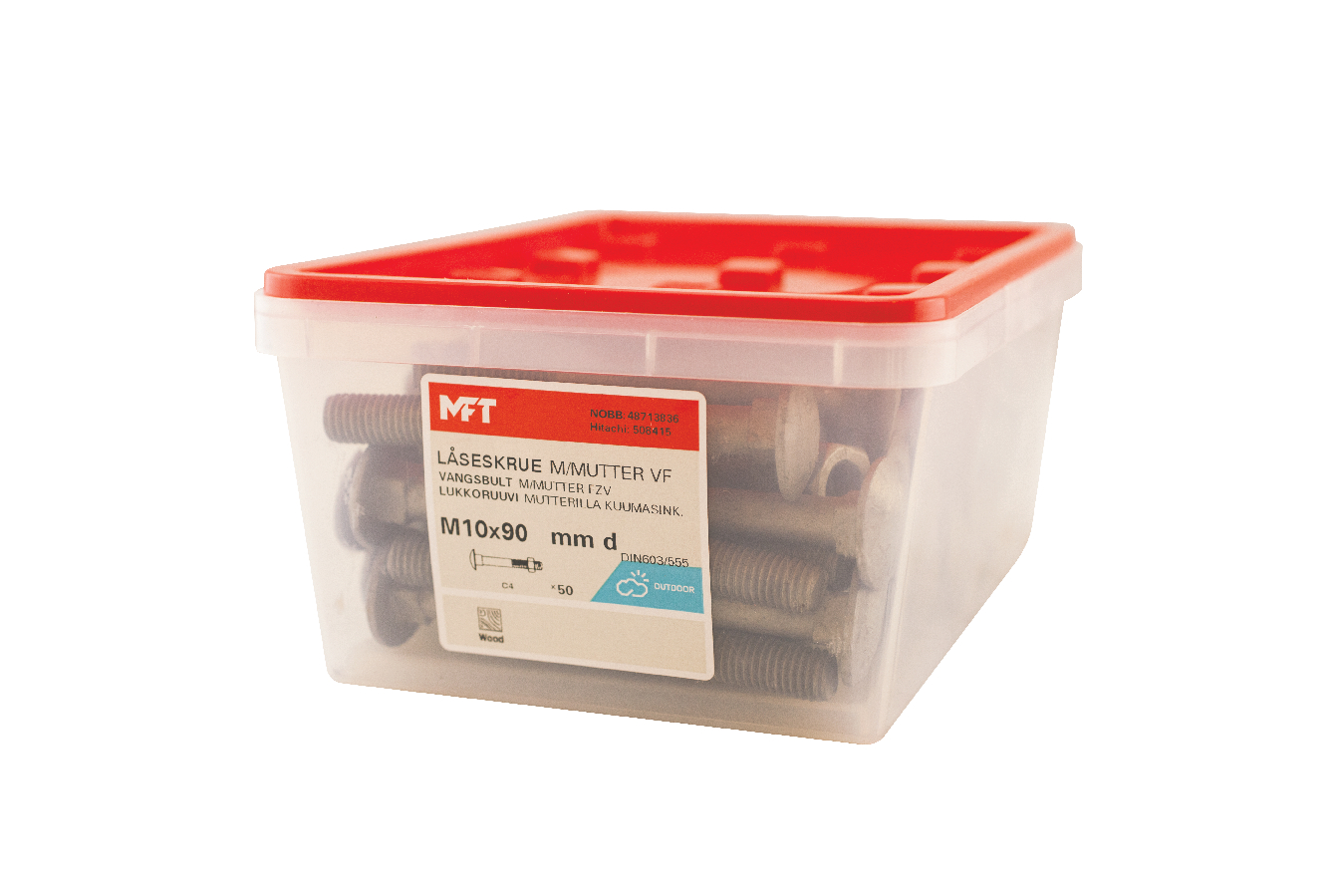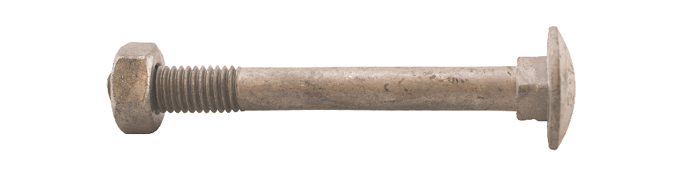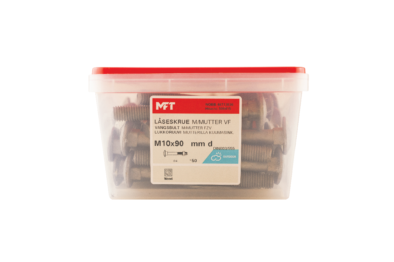 MFT Låseskrue med mutter, låseskruen er produsert i henhold til DIN603 og mutter i henhold til DIN934 standard i herdet karbonstål, kvalitet 4.8. Låseskrue og mutter har en varmforsinket overflatebehandling. Korrosjonsklasse C3. Delgjenget.