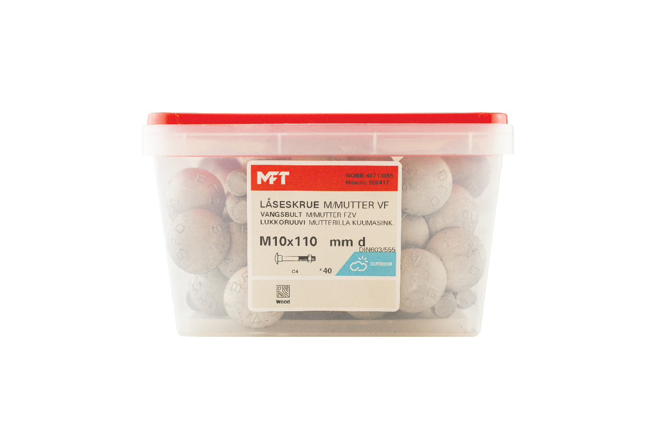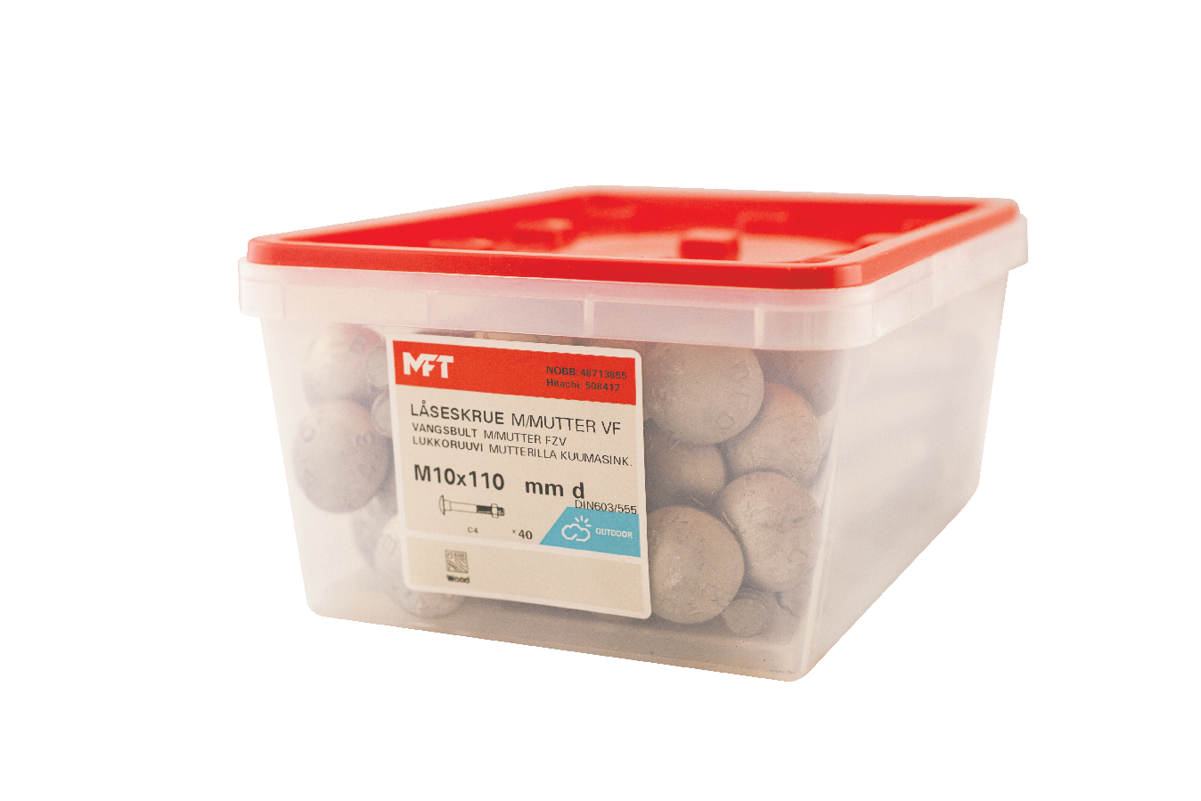 MFT Låseskrue med mutter brukes for sammenskruing av trestendere, platematerialer mot underlag av tre eller stål. Under det kuppelformede hodet er det en firkant som fungerer som en låsing i det mykere materialet da sammenskruing skjer. For innendørs og utendørs bruk.