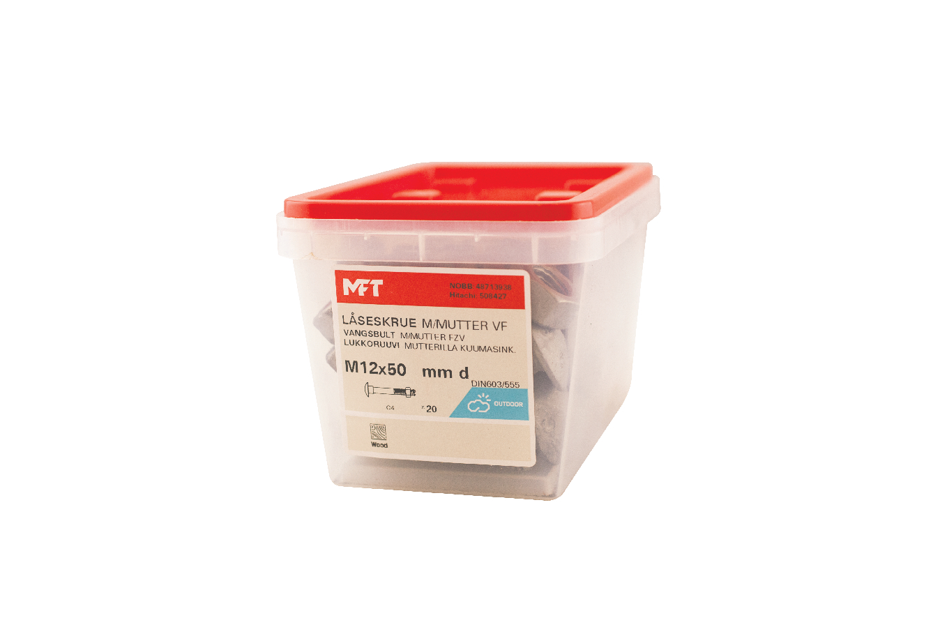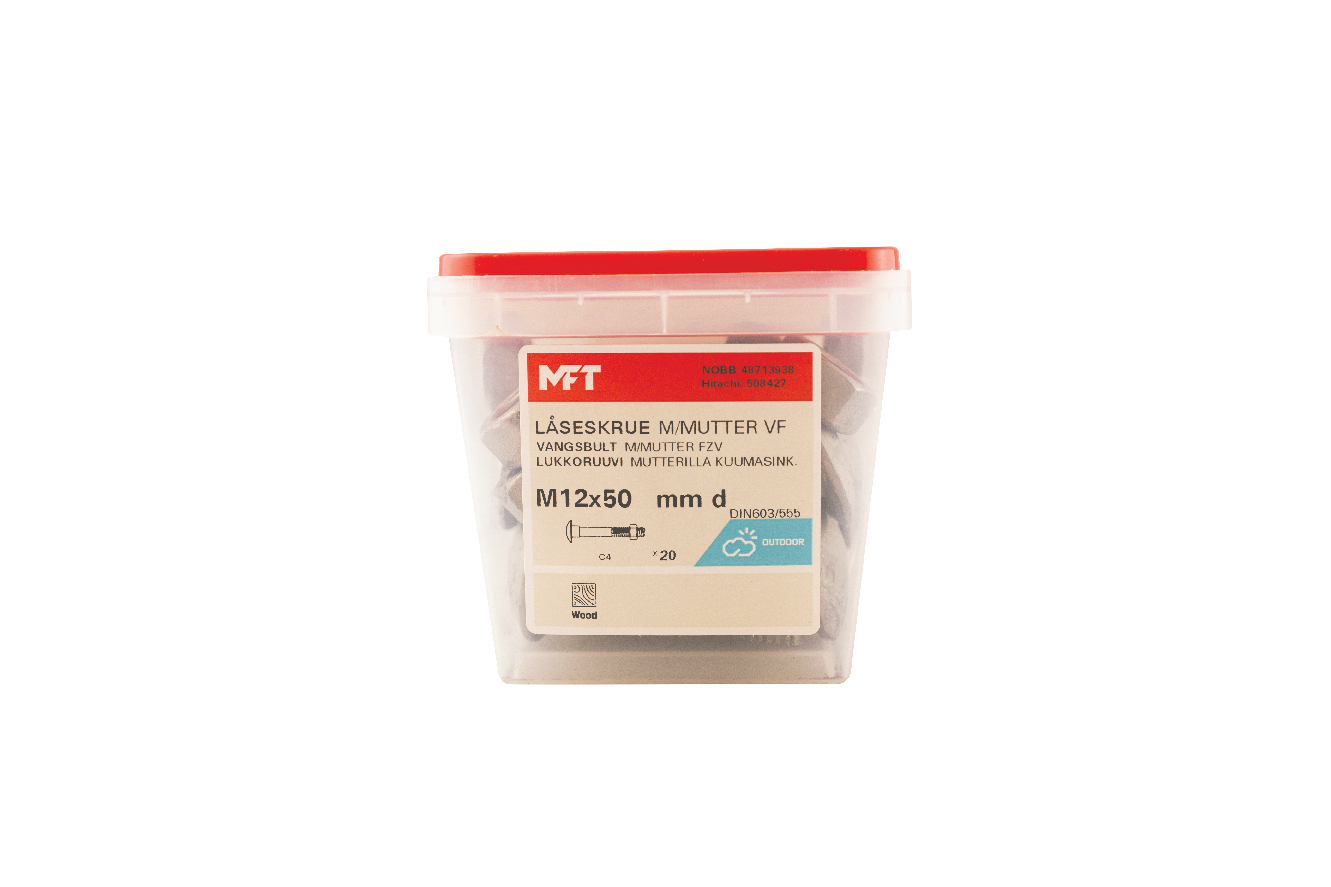 MFT Låseskrue med mutter, låseskruen er produsert i henhold til DIN603 og mutter i henhold til DIN934 standard i herdet karbonstål, kvalitet 4.8. Låseskrue og mutter har en varmforsinket overflatebehandling. Korrosjonsklasse C3. Delgjenget.