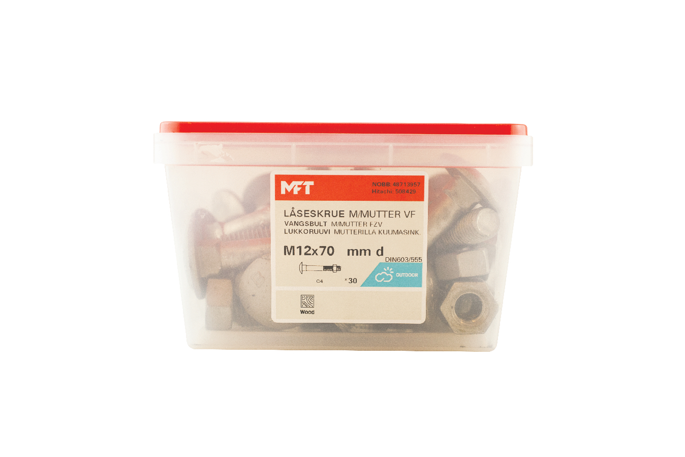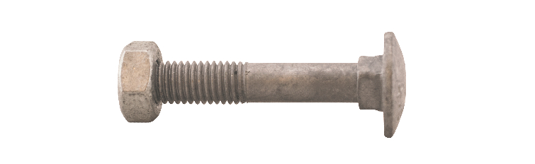 MFT Låseskrue med mutter, låseskruen er produsert i henhold til DIN603 og mutter i henhold til DIN934 standard i herdet karbonstål, kvalitet 4.8. Låseskrue og mutter har en varmforsinket overflatebehandling. Korrosjonsklasse C3. Delgjenget.