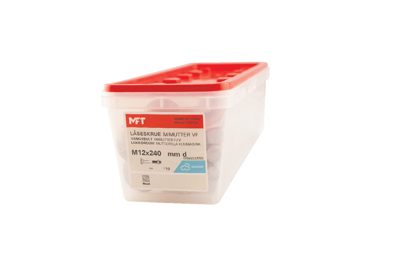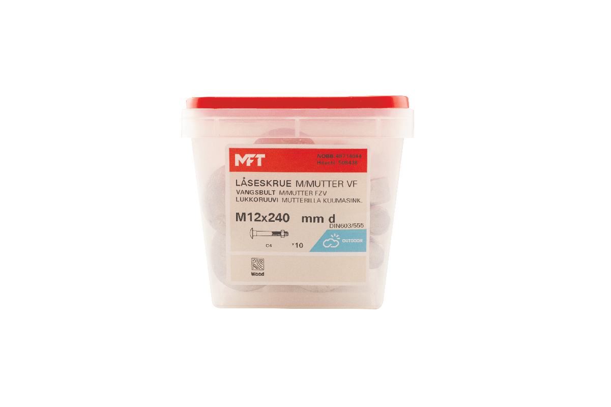 MFT Låseskrue med mutter brukes for sammenskruing av trestendere, platematerialer mot underlag av tre eller stål. Under det kuppelformede hodet er det en firkant som fungerer som en låsing i det mykere materialet da sammenskruing skjer. For innendørs og utendørs bruk.