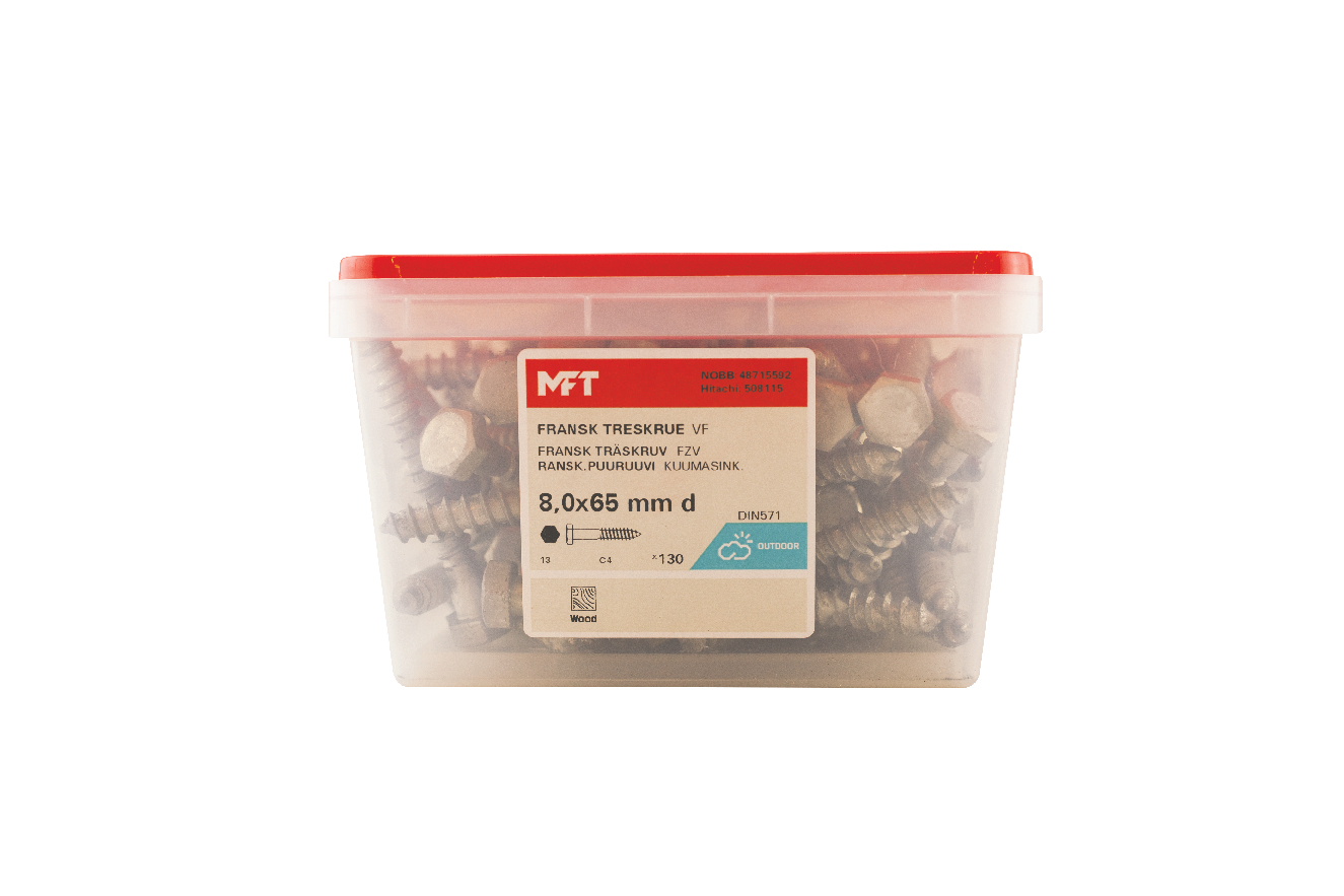 MFT Fransk treskrue med varmforsinket overflatebehandling laget i karbonstål, kvalitet 4.6. Korrosjonsklasse C3. Skruen er produsert ihht. DIN 571. Sekskantshode og delgjenget.