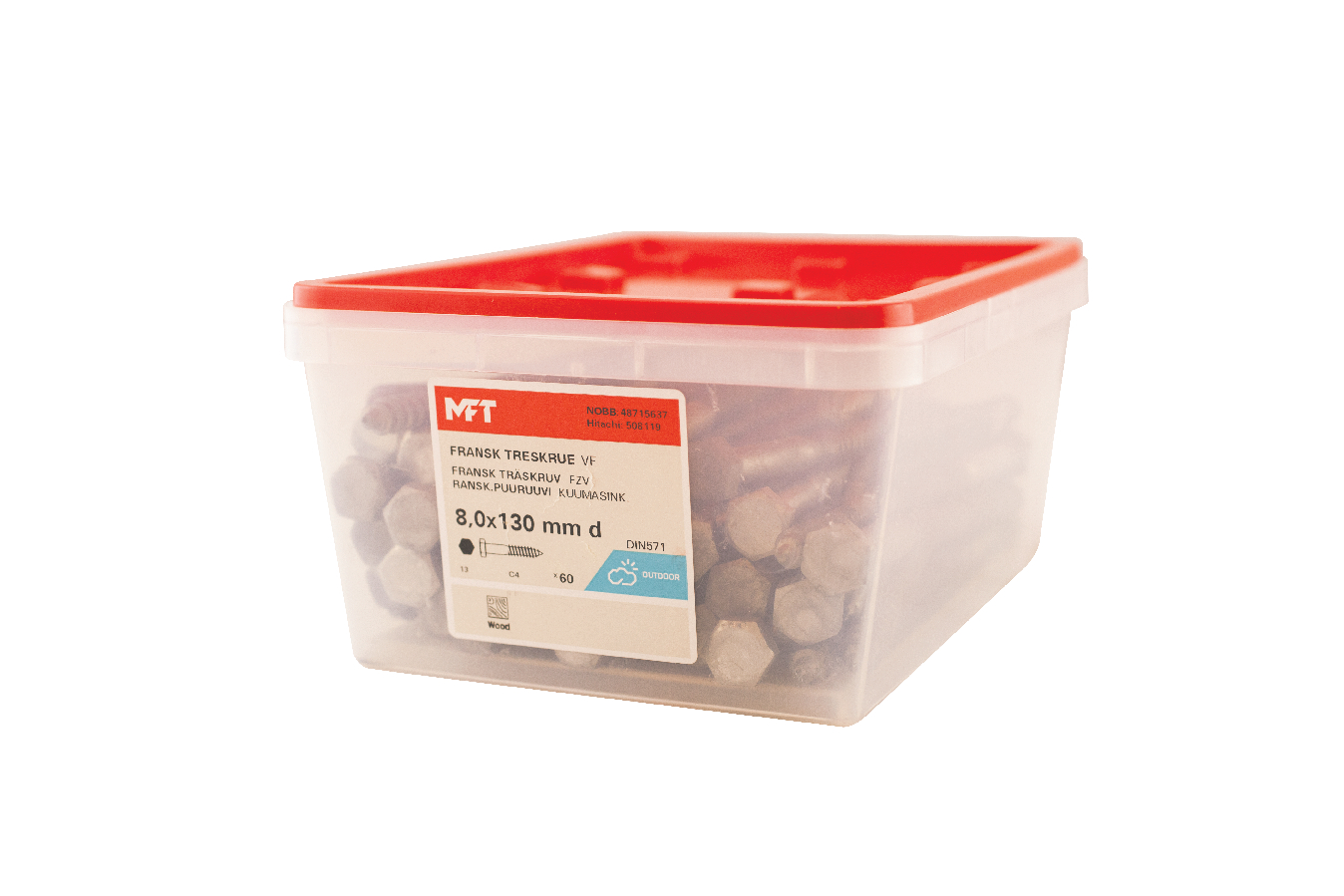 MFT Fransk treskrue er beregnet for montasje i tre innendørs og utendørs. Forborring kan anbefales med tilpasset bordiameter, bruk gjerne varmforsinket firkantskive, DIN436, som gir et forbedret resultat. Anbefalt innskruingshastighet: 400-1200/min.