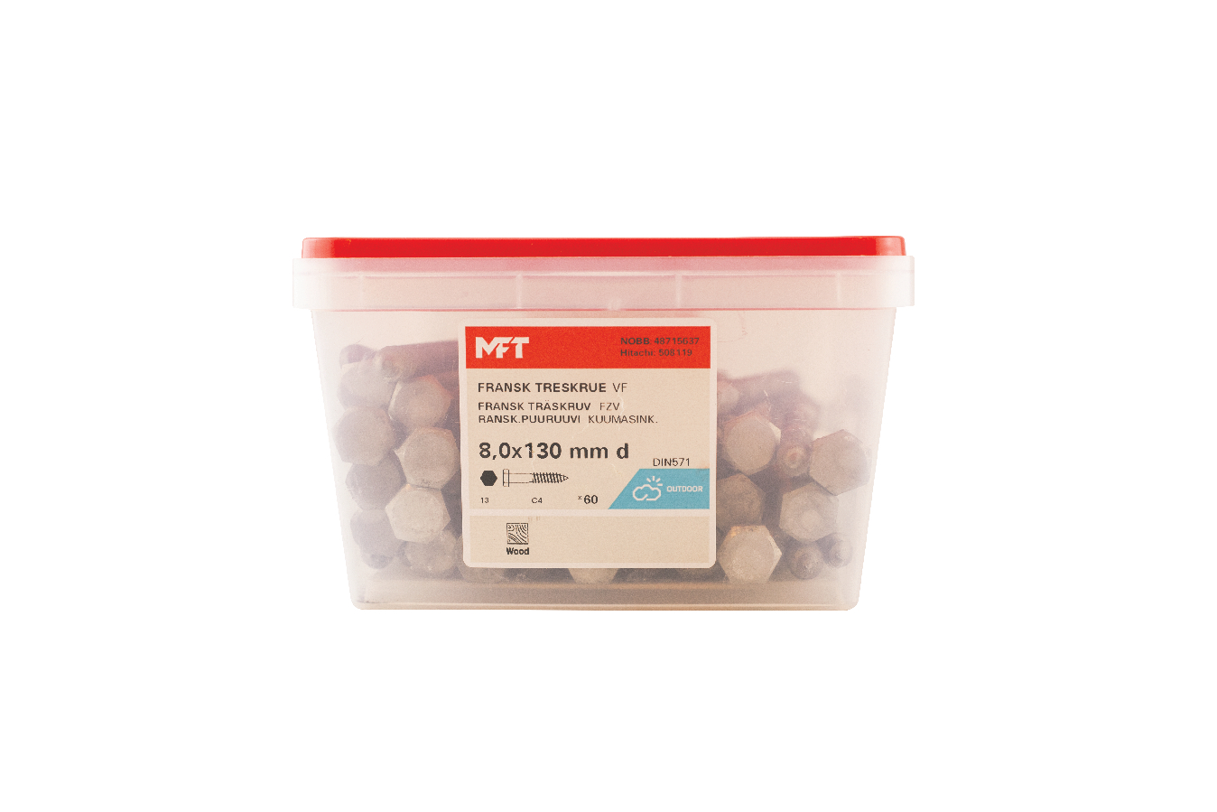 MFT Fransk treskrue med varmforsinket overflatebehandling laget i karbonstål, kvalitet 4.6. Korrosjonsklasse C3. Skruen er produsert ihht. DIN 571. Sekskantshode og delgjenget.
