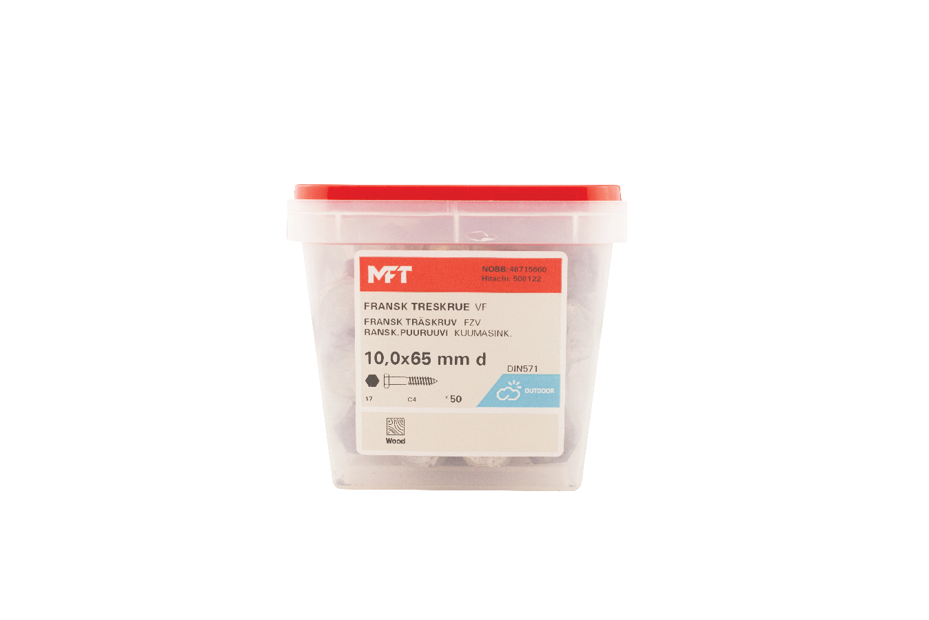 MFT Fransk treskrue med varmforsinket overflatebehandling laget i karbonstål, kvalitet 4.6. Korrosjonsklasse C3. Skruen er produsert ihht. DIN 571. Sekskantshode og delgjenget.