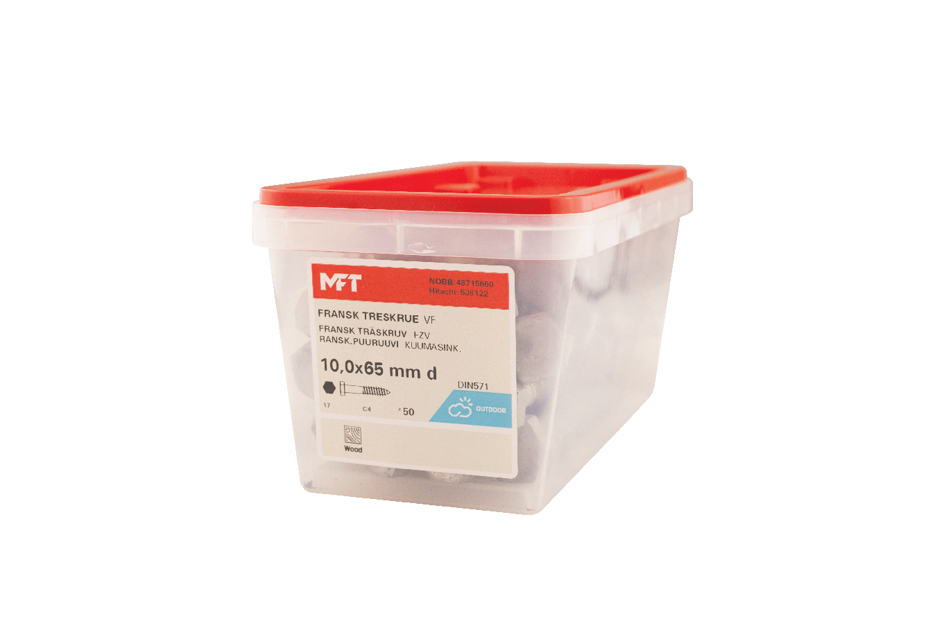 MFT Fransk treskrue er beregnet for montasje i tre innendørs og utendørs. Forborring kan anbefales med tilpasset bordiameter, bruk gjerne varmforsinket firkantskive, DIN436, som gir et forbedret resultat. Anbefalt innskruingshastighet: 400-1200/min.
