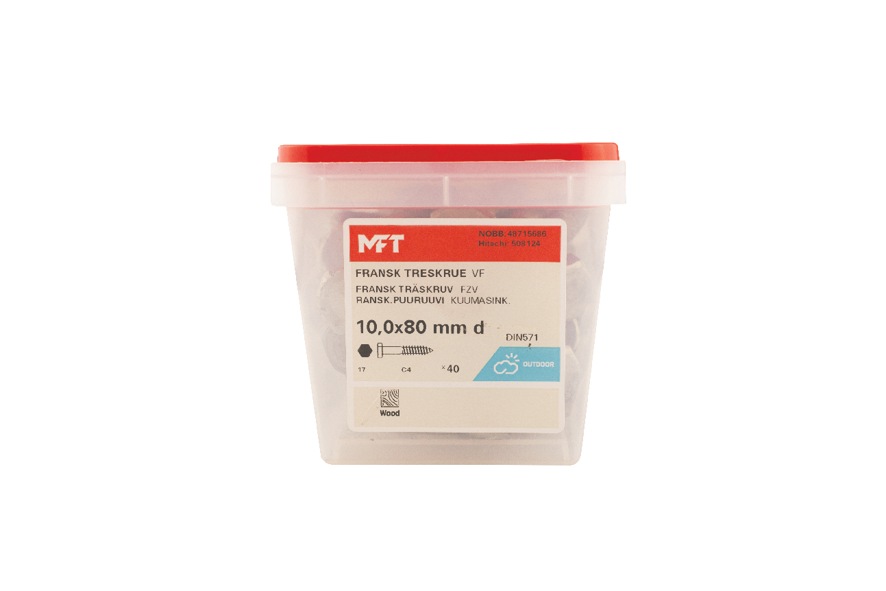 MFT Fransk treskrue er beregnet for montasje i tre innendørs og utendørs. Forborring kan anbefales med tilpasset bordiameter, bruk gjerne varmforsinket firkantskive, DIN436, som gir et forbedret resultat. Anbefalt innskruingshastighet: 400-1200/min.
