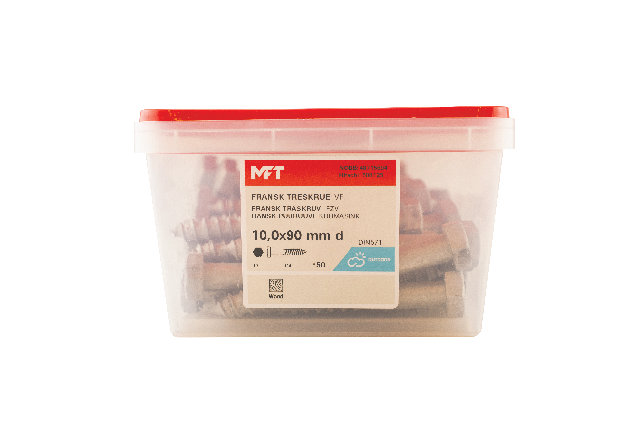 MFT Fransk treskrue med varmforsinket overflatebehandling laget i karbonstål, kvalitet 4.6. Korrosjonsklasse C3. Skruen er produsert ihht. DIN 571. Sekskantshode og delgjenget.