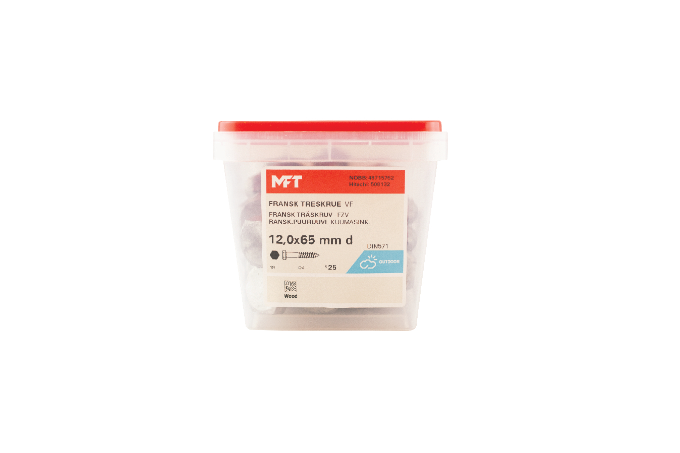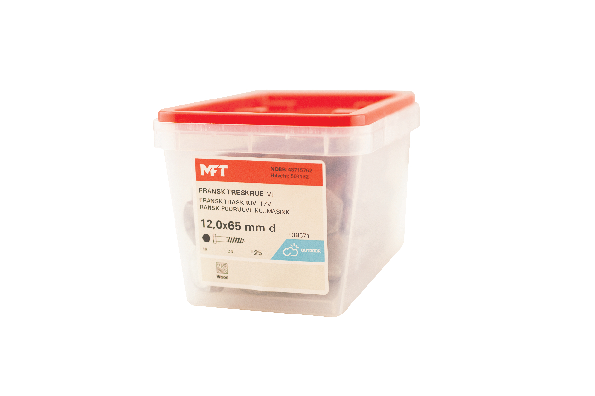 MFT Fransk treskrue med varmforsinket overflatebehandling laget i karbonstål, kvalitet 4.6. Korrosjonsklasse C3. Skruen er produsert ihht. DIN 571. Sekskantshode og delgjenget.