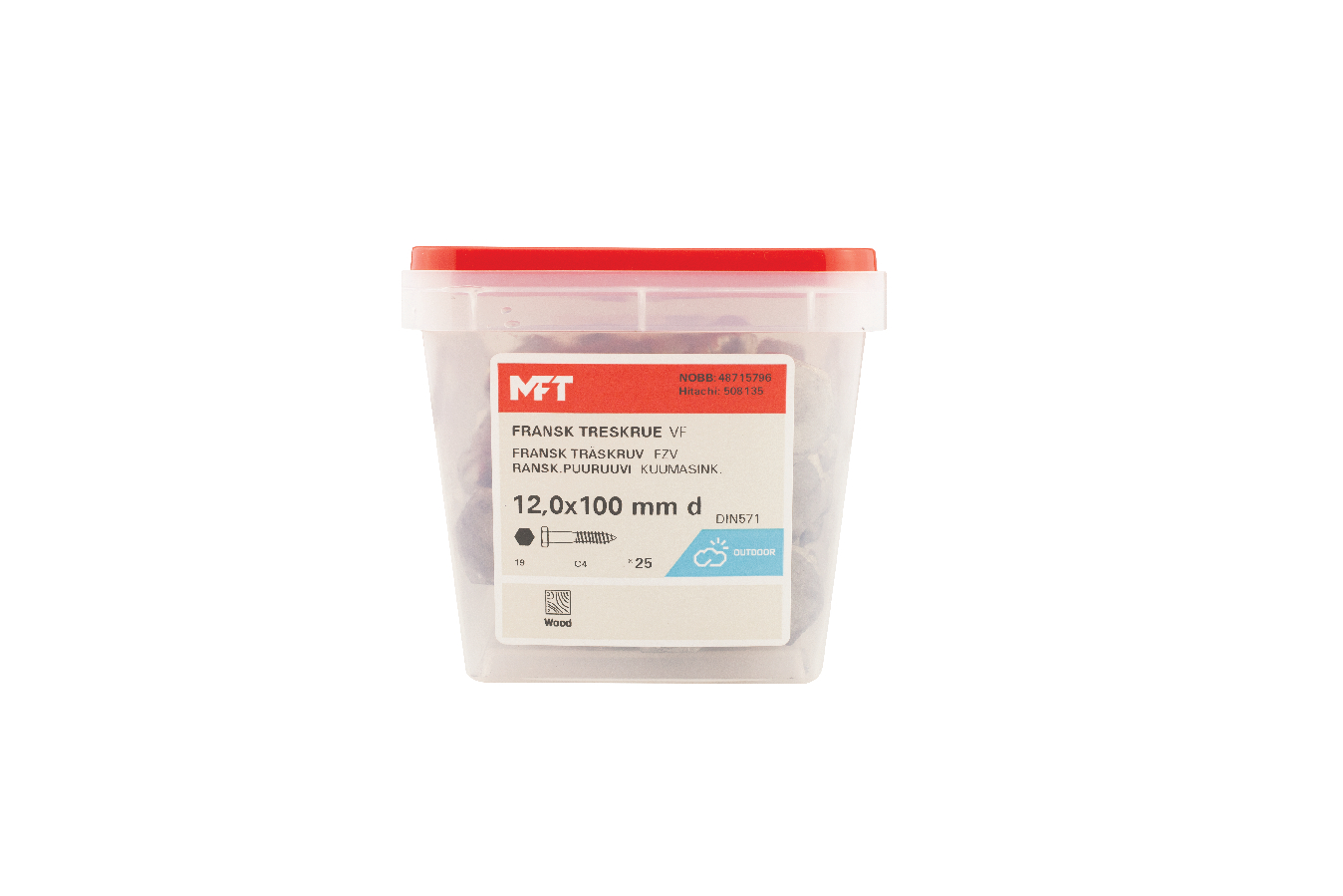 MFT Fransk treskrue med varmforsinket overflatebehandling laget i karbonstål, kvalitet 4.6. Korrosjonsklasse C3. Skruen er produsert ihht. DIN 571. Sekskantshode og delgjenget.