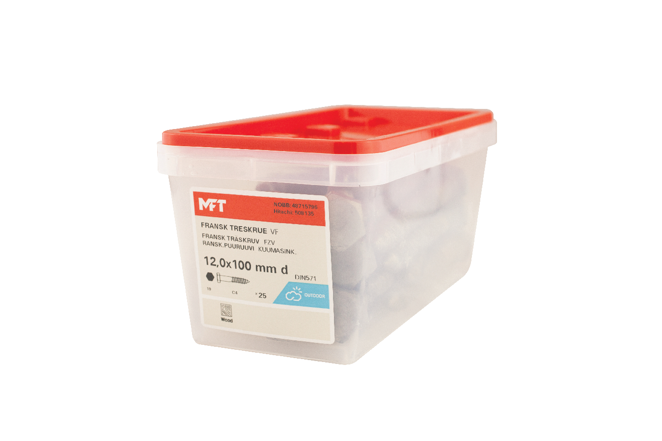 MFT Fransk treskrue er beregnet for montasje i tre innendørs og utendørs. Forborring kan anbefales med tilpasset bordiameter, bruk gjerne varmforsinket firkantskive, DIN436, som gir et forbedret resultat. Anbefalt innskruingshastighet: 400-1200/min.