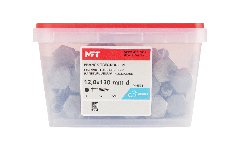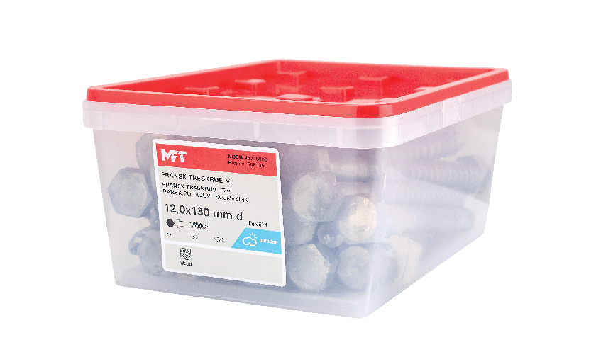 MFT Fransk treskrue er beregnet for montasje i tre innendørs og utendørs. Forborring kan anbefales med tilpasset bordiameter, bruk gjerne varmforsinket firkantskive, DIN436, som gir et forbedret resultat. Anbefalt innskruingshastighet: 400-1200/min.