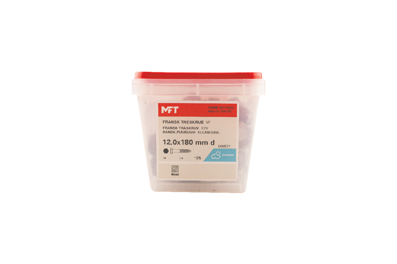MFT Fransk treskrue med varmforsinket overflatebehandling laget i karbonstål, kvalitet 4.6. Korrosjonsklasse C3. Skruen er produsert ihht. DIN 571. Sekskantshode og delgjenget.