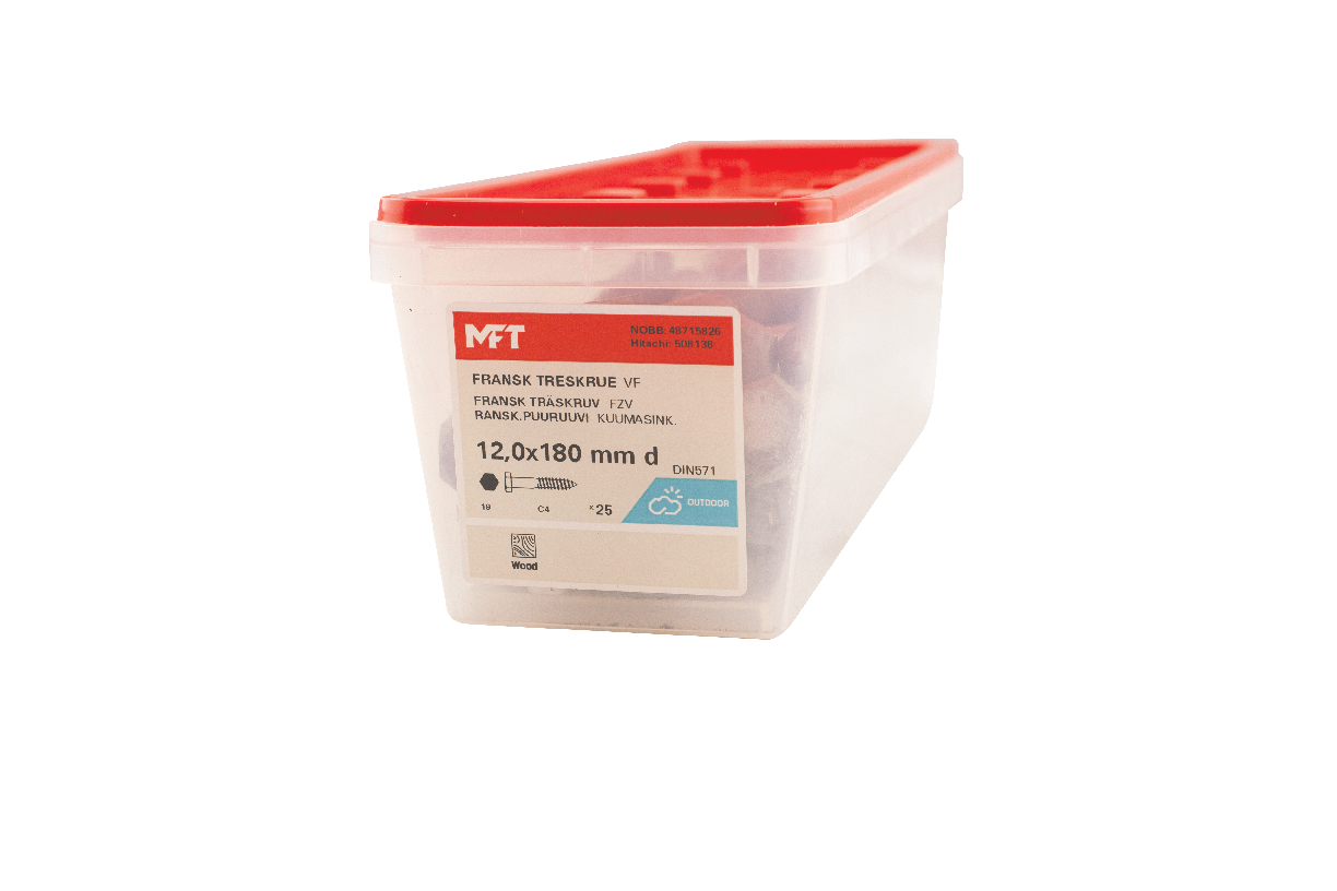 MFT Fransk treskrue er beregnet for montasje i tre innendørs og utendørs. Forborring kan anbefales med tilpasset bordiameter, bruk gjerne varmforsinket firkantskive, DIN436, som gir et forbedret resultat. Anbefalt innskruingshastighet: 400-1200/min.