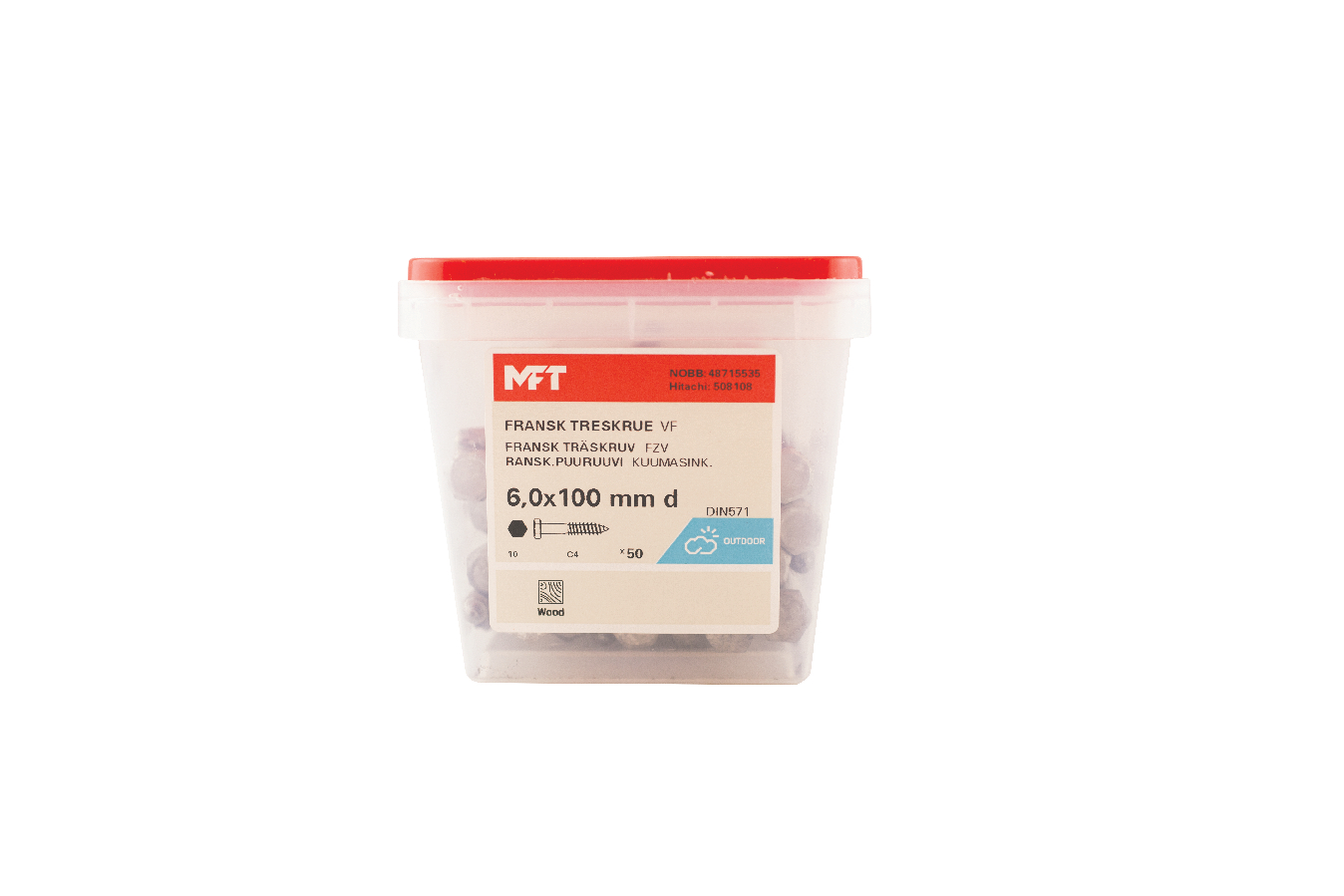 MFT Fransk treskrue med varmforsinket overflatebehandling laget i karbonstål, kvalitet 4.6. Korrosjonsklasse C3. Skruen er produsert ihht. DIN 571. Sekskantshode og delgjenget.