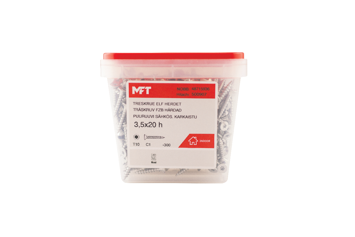 MFT Treskrue forsenket med elektrolytiskbehandling er bergnet for montasje i tre, plugg, spon-/ platematerialer innendørs. Anbefalt innskruingshastighet: 400-1200/min.