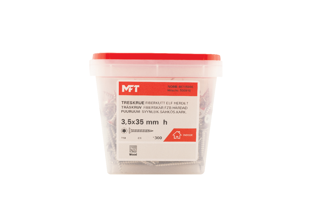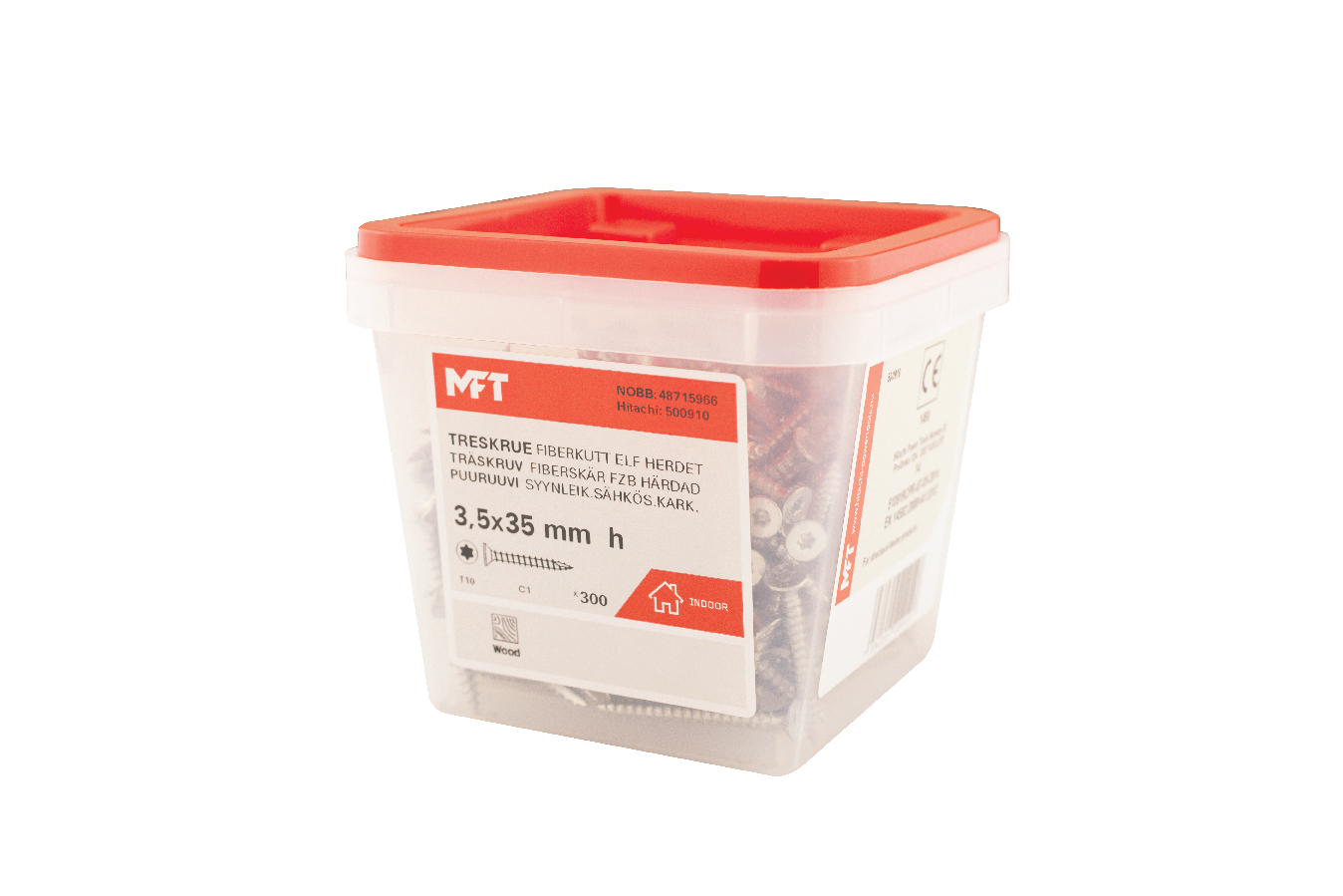 MFT Treskrue forsenket med elektrolytiskbehandling er bergnet for montasje i tre, plugg, spon-/ platematerialer innendørs. Anbefalt innskruingshastighet: 400-1200/min.
