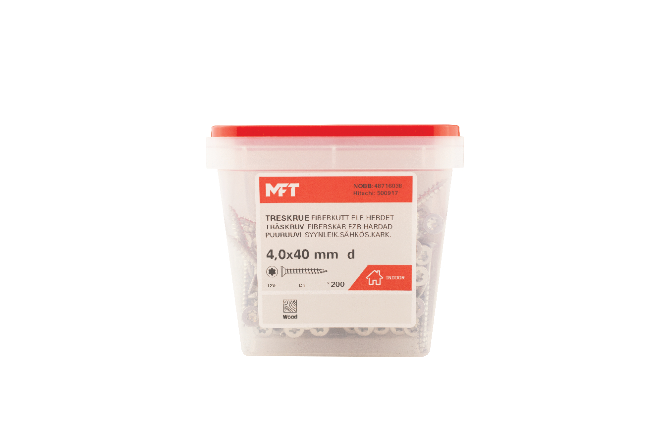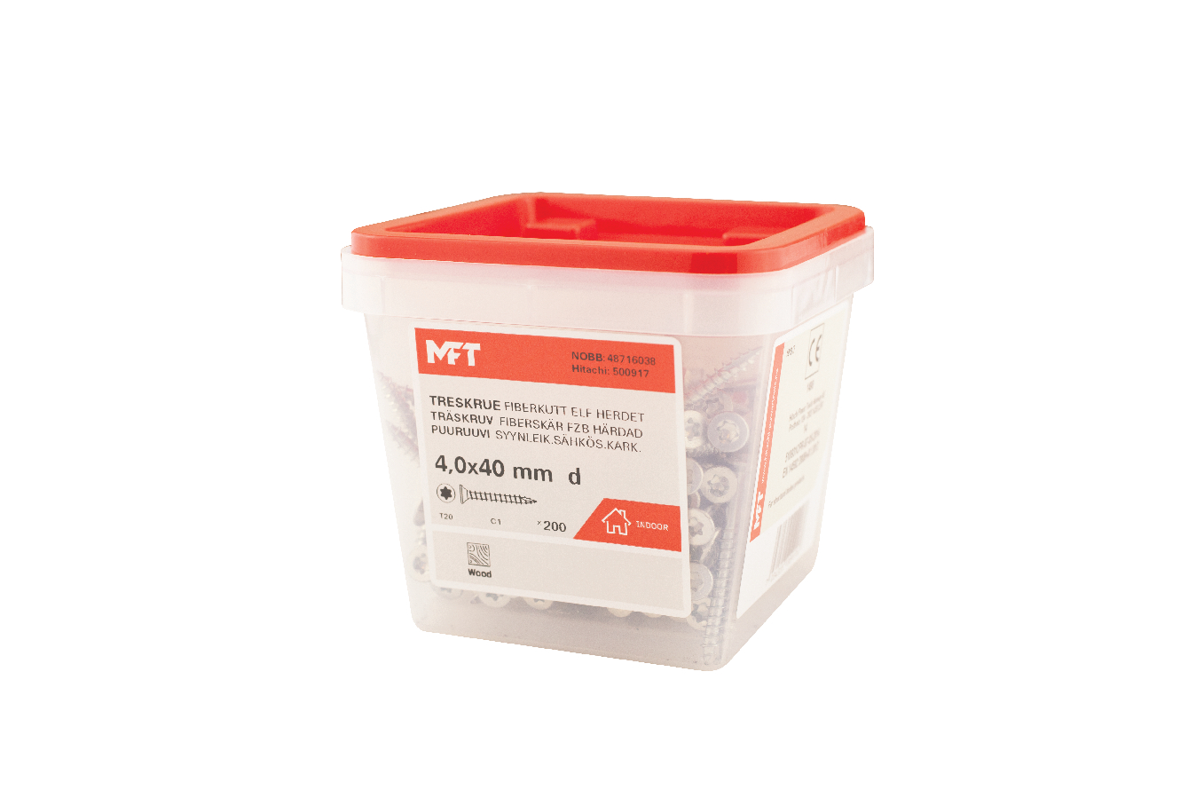 MFT Treskrue forsenket med elektrolytiskbehandling er bergnet for montasje i tre, plugg, spon-/ platematerialer innendørs. Anbefalt innskruingshastighet: 400-1200/min.