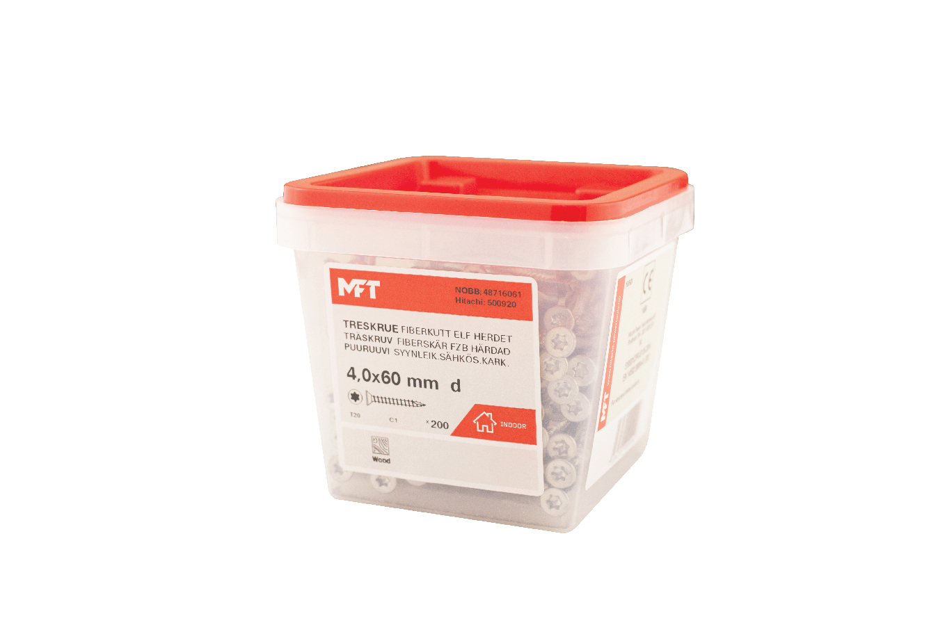 MFT Treskrue forsenket med elektrolytiskbehandling er bergnet for montasje i tre, plugg, spon-/ platematerialer innendørs. Anbefalt innskruingshastighet: 400-1200/min.