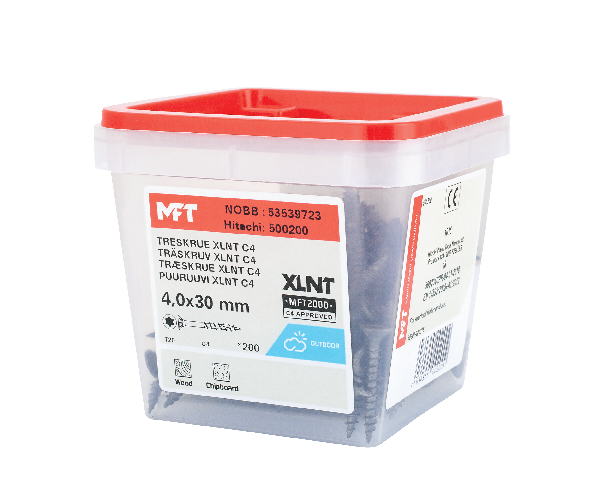 MFT Treskrue XLNT med forsenket hodet og MFT 2000 C4 testet overflatebehandling er produsert av herdet karbonstål SAE 10B21. Korrosjonsklasse C4 med Testrapport 39-17692/JP. Skruen har et fiberskjær for å redusere faren for sprekkdannelse og gir et lavt iskruingsmoment. Freseriller under hodet som forsenker skruen og etterlater en slett flate uten fliser. TX bitsfeste for optimalt grep mellom skrue og bits. Helgjenget.