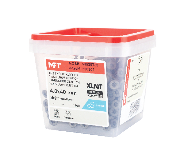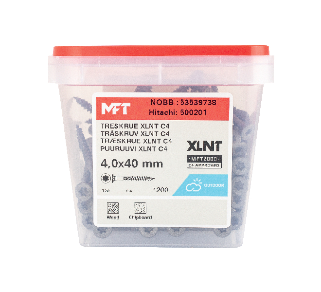 MFT Treskrue XLNT med forsenket hodet og MFT 2000 C4 testet overflatebehandling er produsert av herdet karbonstål SAE 10B21. Korrosjonsklasse C4 med Testrapport 39-17692/JP. Skruen har et fiberskjær for å redusere faren for sprekkdannelse og gir et lavt iskruingsmoment. Freseriller under hodet som forsenker skruen og etterlater en slett flate uten fliser. TX bitsfeste for optimalt grep mellom skrue og bits. Helgjenget.