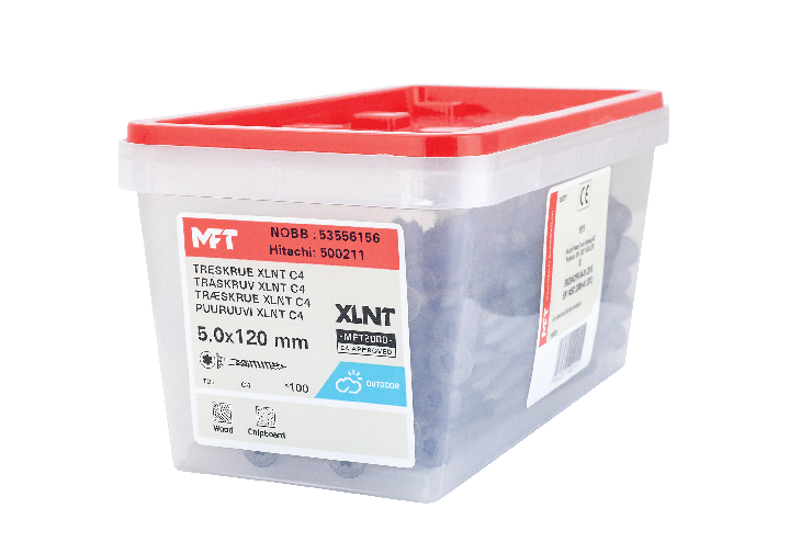 MFT Treskrue XLNT med forsenket hodet og MFT 2000 C4 testet overflatebehandling er produsert av herdet karbonstål SAE 10B21. Korrosjonsklasse C4 med Testrapport 39-17692/JP. Skruen har et fiberskjær for å redusere faren for sprekkdannelse og gir et lavt iskruingsmoment. Freseriller under hodet som forsenker skruen og etterlater en slett flate uten fliser. TX bitsfeste for optimalt grep mellom skrue og bits. Helgjenget.