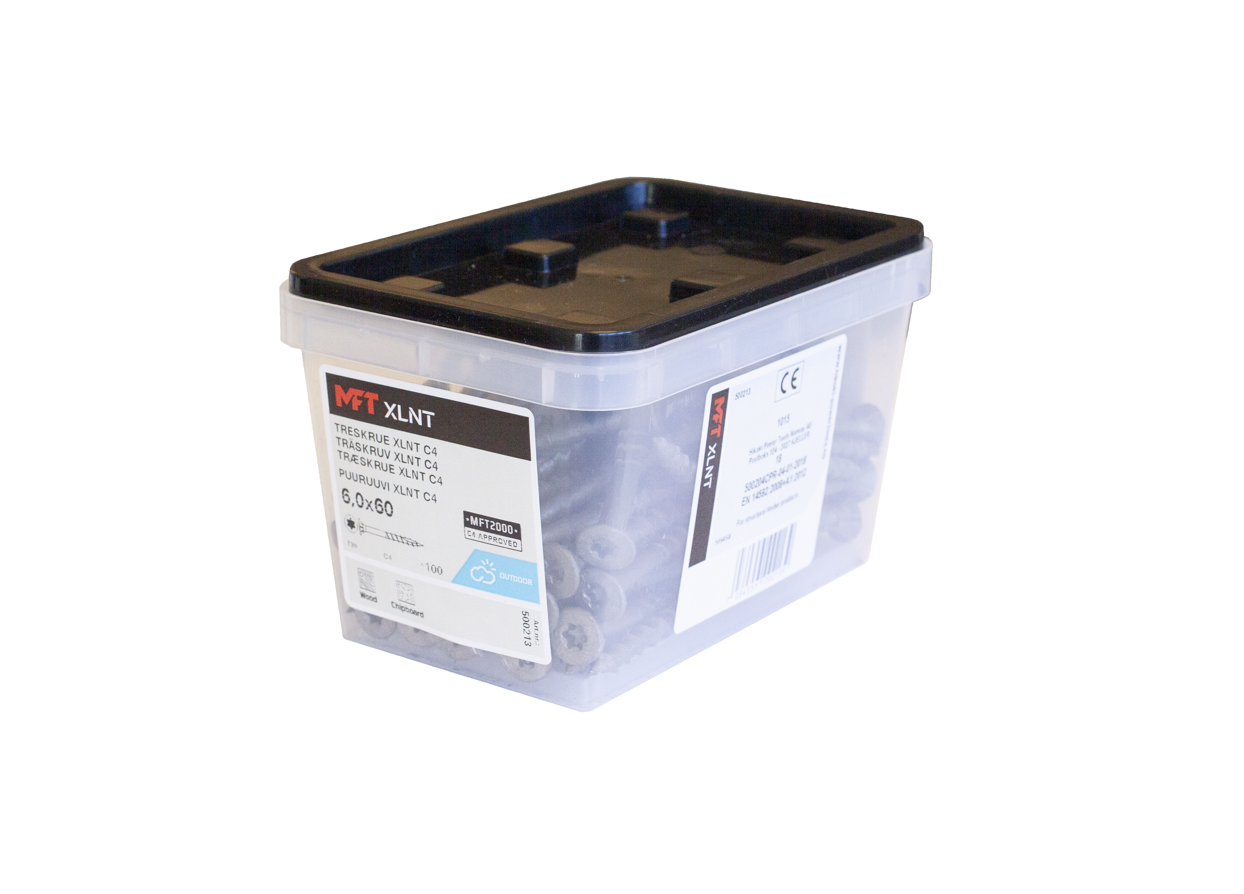 MFT Treskrue XLNT med forsenket hodet og MFT 2000 C4 testet overflatebehandling er produsert av herdet karbonstål SAE 10B21. Korrosjonsklasse C4 med Testrapport 39-17692/JP. Skruen har et fiberskjær for å redusere faren for sprekkdannelse og gir et lavt iskruingsmoment. Freseriller under hodet som forsenker skruen og etterlater en slett flate uten fliser. TX bitsfeste for optimalt grep mellom skrue og bits. Helgjenget.