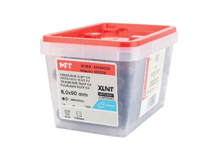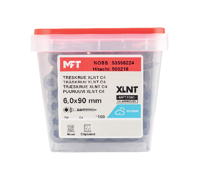 MFT Treskrue XLNT med forsenket hodet og MFT 2000 C4 testet overflatebehandling er produsert av herdet karbonstål SAE 10B21. Korrosjonsklasse C4 med Testrapport 39-17692/JP. Skruen har et fiberskjær for å redusere faren for sprekkdannelse og gir et lavt iskruingsmoment. Freseriller under hodet som forsenker skruen og etterlater en slett flate uten fliser. TX bitsfeste for optimalt grep mellom skrue og bits. Helgjenget.