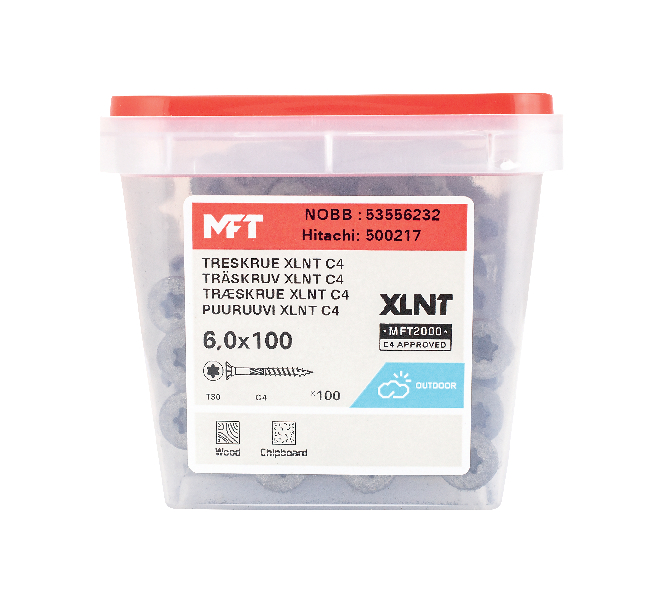 MFT Treskrue XLNT med forsenket hodet og MFT 2000 C4 testet overflatebehandling er produsert av herdet karbonstål SAE 10B21. Korrosjonsklasse C4 med Testrapport 39-17692/JP. Skruen har et fiberskjær for å redusere faren for sprekkdannelse og gir et lavt iskruingsmoment. Freseriller under hodet som forsenker skruen og etterlater en slett flate uten fliser. TX bitsfeste for optimalt grep mellom skrue og bits. Helgjenget.