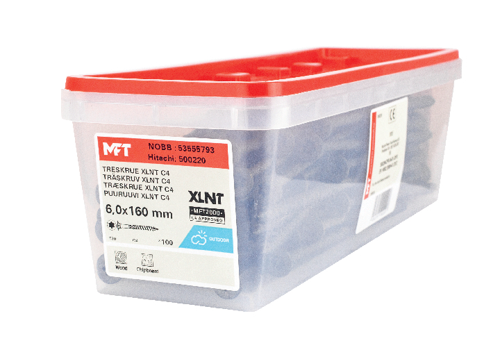 MFT Treskrue XLNT med forsenket hode er tilpasset for montasje i trekonstruksjoner der det stilles høye krav, som f.eks. ved skruing av bærende konstruksjoner til terrasser, uteplasser mm. Overflatebehandling MFT 2000 gjør at skruen kan monteres innen-/utendørs i C4 klassifiserte miljøer. For innendørs og utendørs bruk.