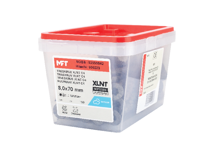MFT Treskrue XLNT med forsenket hodet og MFT 2000 C4 testet overflatebehandling er produsert av herdet karbonstål SAE 10B21. Korrosjonsklasse C4 med Testrapport 39-17692/JP. Skruen har et fiberskjær for å redusere faren for sprekkdannelse og gir et lavt iskruingsmoment. Freseriller under hodet som forsenker skruen og etterlater en slett flate uten fliser. TX bitsfeste for optimalt grep mellom skrue og bits. Helgjenget.