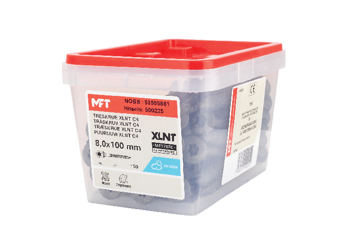 MFT Treskrue XLNT med forsenket hodet og MFT 2000 C4 testet overflatebehandling er produsert av herdet karbonstål SAE 10B21. Korrosjonsklasse C4 med Testrapport 39-17692/JP. Skruen har et fiberskjær for å redusere faren for sprekkdannelse og gir et lavt iskruingsmoment. Freseriller under hodet som forsenker skruen og etterlater en slett flate uten fliser. TX bitsfeste for optimalt grep mellom skrue og bits. Helgjenget.