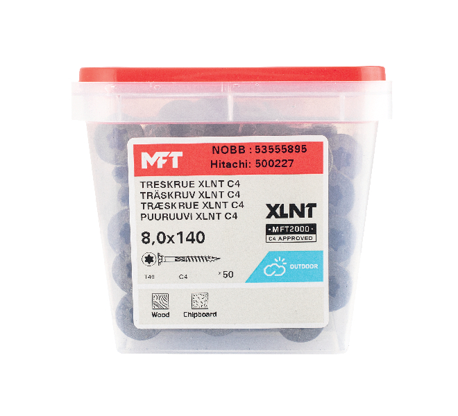 MFT Treskrue XLNT med forsenket hodet og MFT 2000 C4 testet overflatebehandling er produsert av herdet karbonstål SAE 10B21. Korrosjonsklasse C4 med Testrapport 39-17692/JP. Skruen har et fiberskjær for å redusere faren for sprekkdannelse og gir et lavt iskruingsmoment. Freseriller under hodet som forsenker skruen og etterlater en slett flate uten fliser. TX bitsfeste for optimalt grep mellom skrue og bits. Helgjenget.