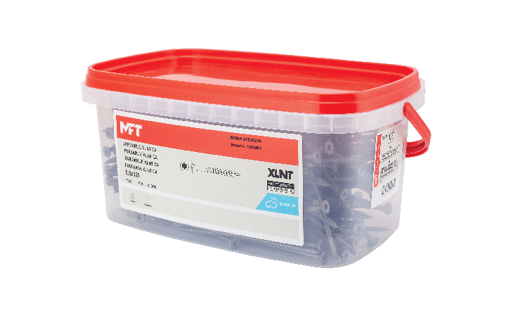 MFT Treskrue XLNT med forsenket hodet og MFT 2000 C4 testet overflatebehandling er produsert av herdet karbonstål SAE 10B21. Korrosjonsklasse C4 med Testrapport 39-17692/JP. Skruen har et fiberskjær for å redusere faren for sprekkdannelse og gir et lavt iskruingsmoment. Freseriller under hodet som forsenker skruen og etterlater en slett flate uten fliser. TX bitsfeste for optimalt grep mellom skrue og bits. Helgjenget.