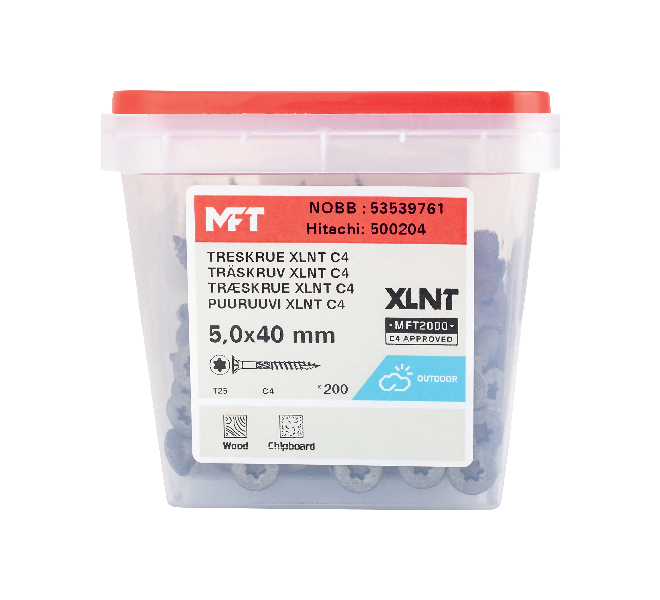 MFT Treskrue XLNT med forsenket hodet og MFT 2000 C4 testet overflatebehandling er produsert av herdet karbonstål SAE 10B21. Korrosjonsklasse C4 med Testrapport 39-17692/JP. Skruen har et fiberskjær for å redusere faren for sprekkdannelse og gir et lavt iskruingsmoment. Freseriller under hodet som forsenker skruen og etterlater en slett flate uten fliser. TX bitsfeste for optimalt grep mellom skrue og bits. Helgjenget.