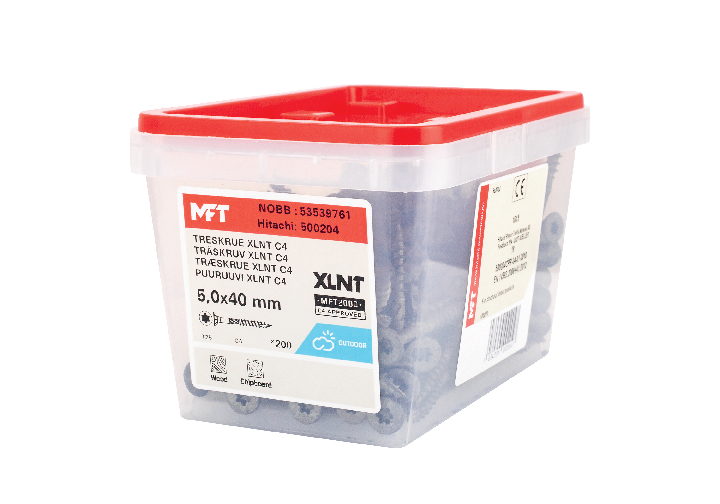 MFT Treskrue XLNT med forsenket hode er tilpasset for montasje i trekonstruksjoner der det stilles høye krav, som f.eks. ved skruing av bærende konstruksjoner til terrasser, uteplasser mm. Overflatebehandling MFT 2000 gjør at skruen kan monteres innen-/utendørs i C4 klassifiserte miljøer. For innendørs og utendørs bruk.