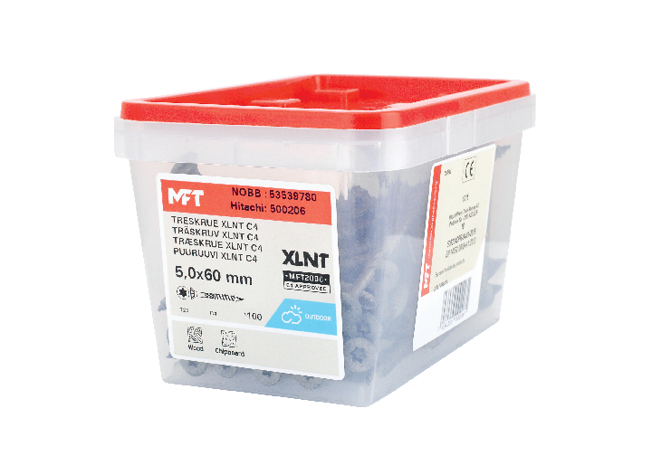 MFT Treskrue XLNT med forsenket hodet og MFT 2000 C4 testet overflatebehandling er produsert av herdet karbonstål SAE 10B21. Korrosjonsklasse C4 med Testrapport 39-17692/JP. Skruen har et fiberskjær for å redusere faren for sprekkdannelse og gir et lavt iskruingsmoment. Freseriller under hodet som forsenker skruen og etterlater en slett flate uten fliser. TX bitsfeste for optimalt grep mellom skrue og bits. Helgjenget.