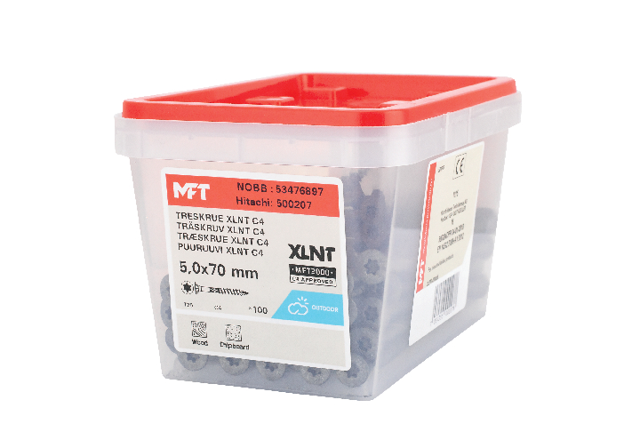 MFT Treskrue XLNT med forsenket hodet og MFT 2000 C4 testet overflatebehandling er produsert av herdet karbonstål SAE 10B21. Korrosjonsklasse C4 med Testrapport 39-17692/JP. Skruen har et fiberskjær for å redusere faren for sprekkdannelse og gir et lavt iskruingsmoment. Freseriller under hodet som forsenker skruen og etterlater en slett flate uten fliser. TX bitsfeste for optimalt grep mellom skrue og bits. Helgjenget.