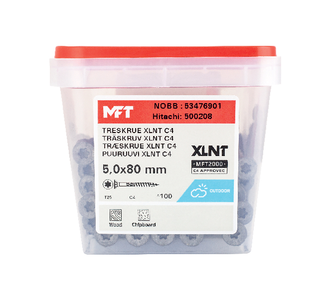 MFT Treskrue XLNT med forsenket hodet og MFT 2000 C4 testet overflatebehandling er produsert av herdet karbonstål SAE 10B21. Korrosjonsklasse C4 med Testrapport 39-17692/JP. Skruen har et fiberskjær for å redusere faren for sprekkdannelse og gir et lavt iskruingsmoment. Freseriller under hodet som forsenker skruen og etterlater en slett flate uten fliser. TX bitsfeste for optimalt grep mellom skrue og bits. Helgjenget.