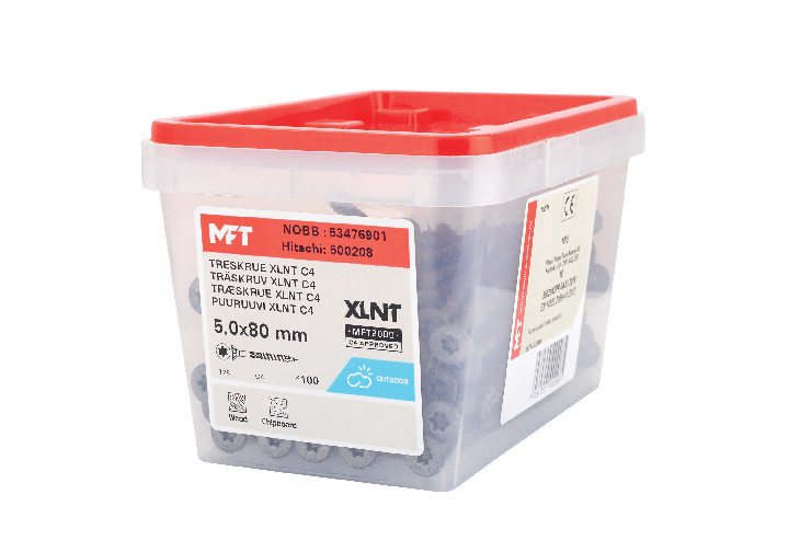 MFT Treskrue XLNT med forsenket hode er tilpasset for montasje i trekonstruksjoner der det stilles høye krav, som f.eks. ved skruing av bærende konstruksjoner til terrasser, uteplasser mm. Overflatebehandling MFT 2000 gjør at skruen kan monteres innen-/utendørs i C4 klassifiserte miljøer. For innendørs og utendørs bruk.