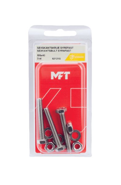MFT Sekskantskrue M6S brukes sammen med mutter ved sammenskruing av detaljer. For innendørs og utendørs bruk.