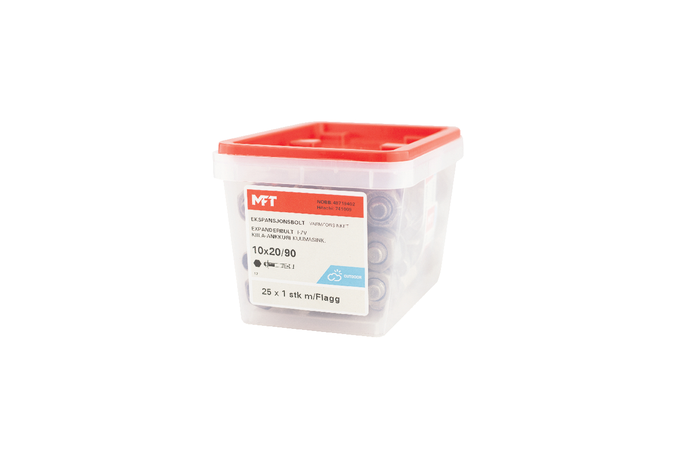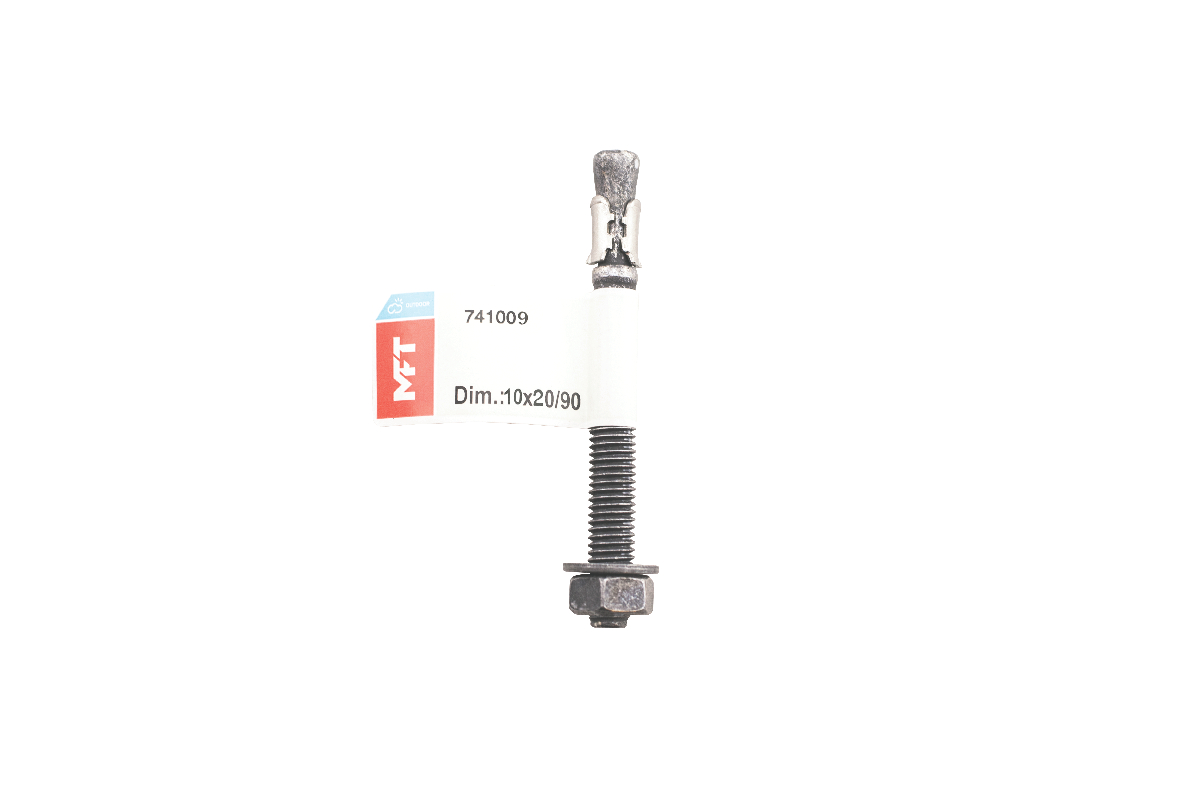 MFT Ekspansjonsbolt Varmgalvanisert er bergnet for innfesting av stål og tredetaljer som beslag, rigler, rekkverk, sviller, beslag mot urisset betong for utendørs bruk. MFT ekspansjonbolt skal brukes i borhull som er lik boltens diameter, dvs gjennomgående montering. Mutteren dras til når bolten er banket inn og flukter med festeobjektet. Ved tiltrekking drar boltens nedre koniske del seg over klipset og gir ekspansjon.