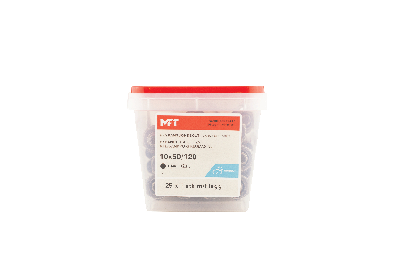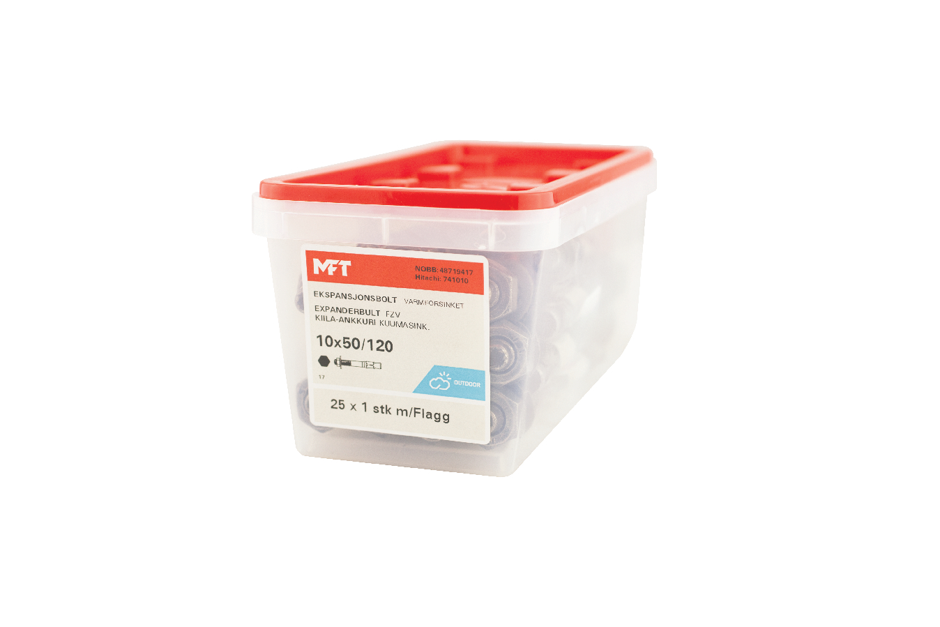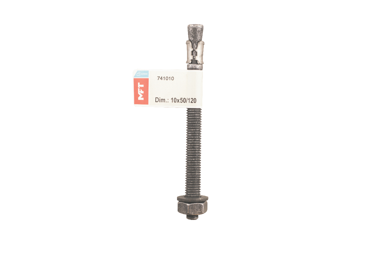 MFT Ekspansjonsbolt Varmgalvanisert er bergnet for innfesting av stål og tredetaljer som beslag, rigler, rekkverk, sviller, beslag mot urisset betong for utendørs bruk. MFT ekspansjonbolt skal brukes i borhull som er lik boltens diameter, dvs gjennomgående montering. Mutteren dras til når bolten er banket inn og flukter med festeobjektet. Ved tiltrekking drar boltens nedre koniske del seg over klipset og gir ekspansjon.
